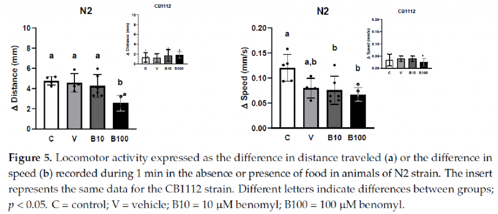 DA Functionality Assessment. Basal Slowing Response: The experimental procedure was set up according to Albrecht et al. (2022), adapted from Chakraborty et al., 2015. At the end of benomyl exposure, 10–15 N2 animals were transferred to plates with NGM medium. After 5 min of habituation, speed and distance traveled for 1 min were measured using WMicrotacker Smart device software (Phylumtech SA, Argentina). The results were expressed as the difference in distance traveled or speed in the absence and presence of food for both the N2 animals and the CB1112 strain, which was considered a positive control for this behavior, provided the low dopamine content resulting from the TH null mutation.