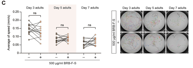 Locomotion speed assay. L4-stage worms were supplemented with 500 μg/mL BRB-F-S for 3, 5, or 7 days to obtain day 3, 5, and 7 adults, respectively, under standard diet conditions. As controls, age-matched worms maintained under identical conditions without BRB-F-S supplementation were used. Worms were washed three times with an M9 buffer and transferred (10–20 worms per plate) onto unseeded 35-mm NGM plates for brief recovery. Locomotion was assessed using the WMicrotracker SMART ×8 system and its associated software (Phylumtech, Argentina). Worms were exposed to blue light stimulation for 10 s, followed by a 5-min video recording.