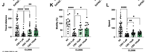 Cognitive improvement after CBD treatment in the in vivo animal models C. elegans. To evaluate the impact of CBD on the progression of AD, the CL2006 strain, one of the best characterized transgenic AD strains, was employed. This strain contains the Punc-54::Aβ1–42 transgene, which results in progressive adult-onset paralysis that has been correlated with increased levels of Aβ aggregates. As shown in Fig. 6H J, treatment with CBD at 10 µM and 100 µM resulted in improved motility of CL2006 worms compared to the CL2006 control group. Accordingly, CBD treatment significantly increased travel distance and speed (Fig. 6J L), confirming the delay of the progressive adult-onset paralysis in CL2006.